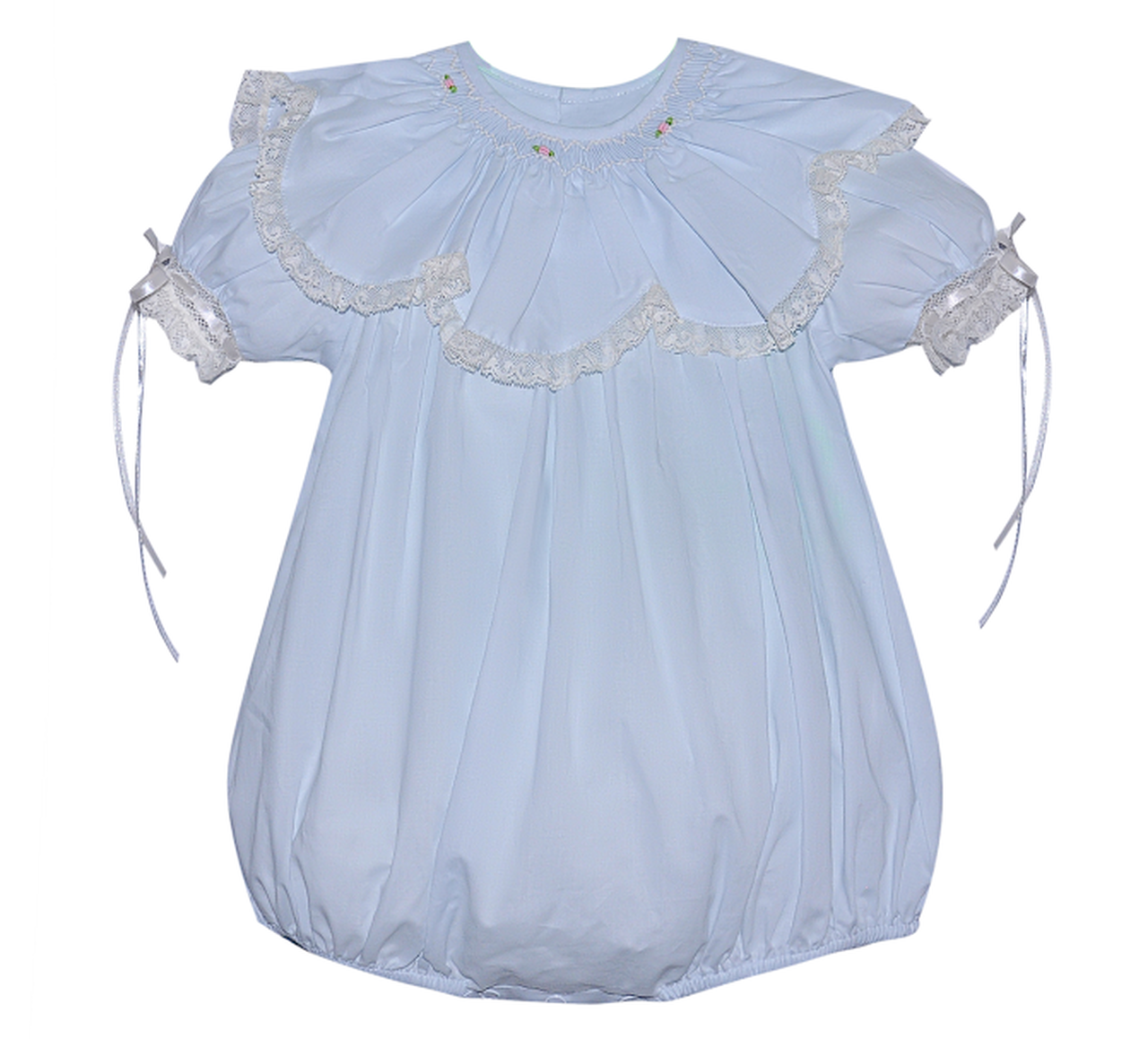 The blue emery bubble is the perfect heirloom bubble. This dress makes for a beautiful flower girl bubble, Easter Outfit, Wedding Guest attire, or any special occasion! This special occasion bubble features beautiful lace and hand woven silk ribbon