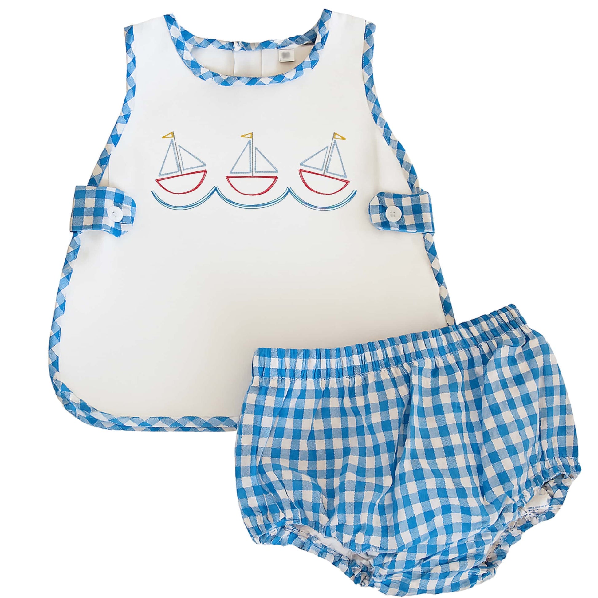 This blue gingham bloomer set is made from soft cotton with a fun sailboat embroidery, perfect for warm, sunny days and playful adventures.