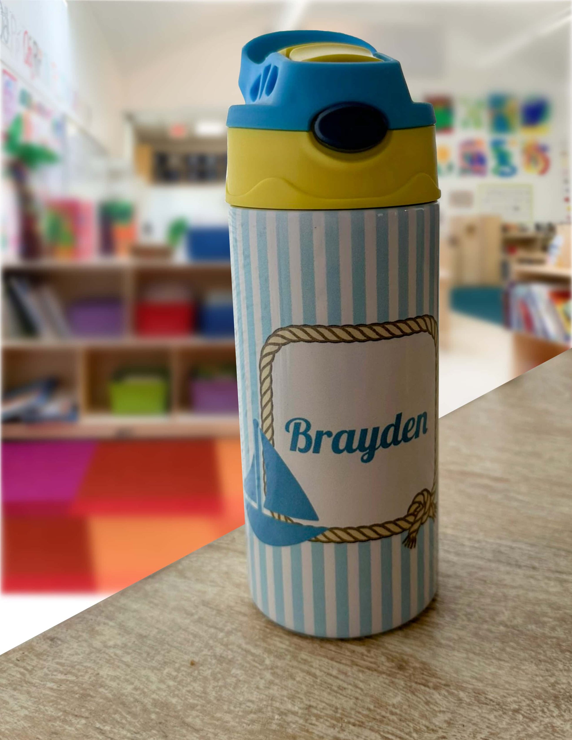 This water bottle comes with the design as shown. Just let us know the name you want on it and we will do the rest! These bottles are dishwasher safe and super cute. This particular bottle comes with the nautical sailboat design.
