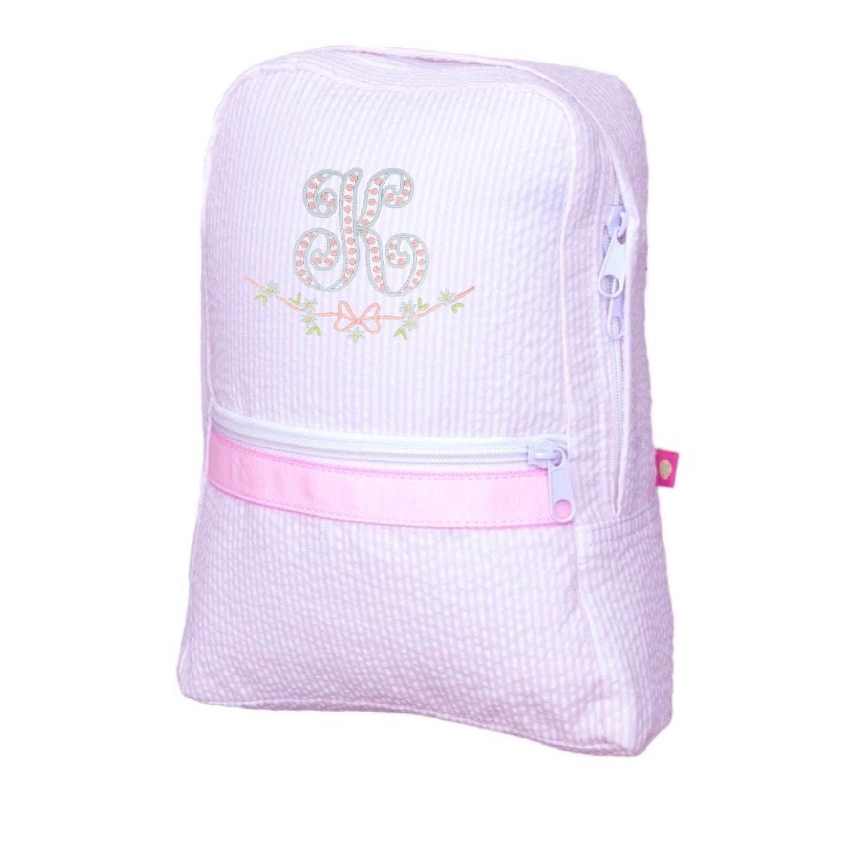 This embroidery style is just the single Initial. This medium seersucker backpack is perfect to use as a diaper bag or school bag! Let us know if you have a custom design request!