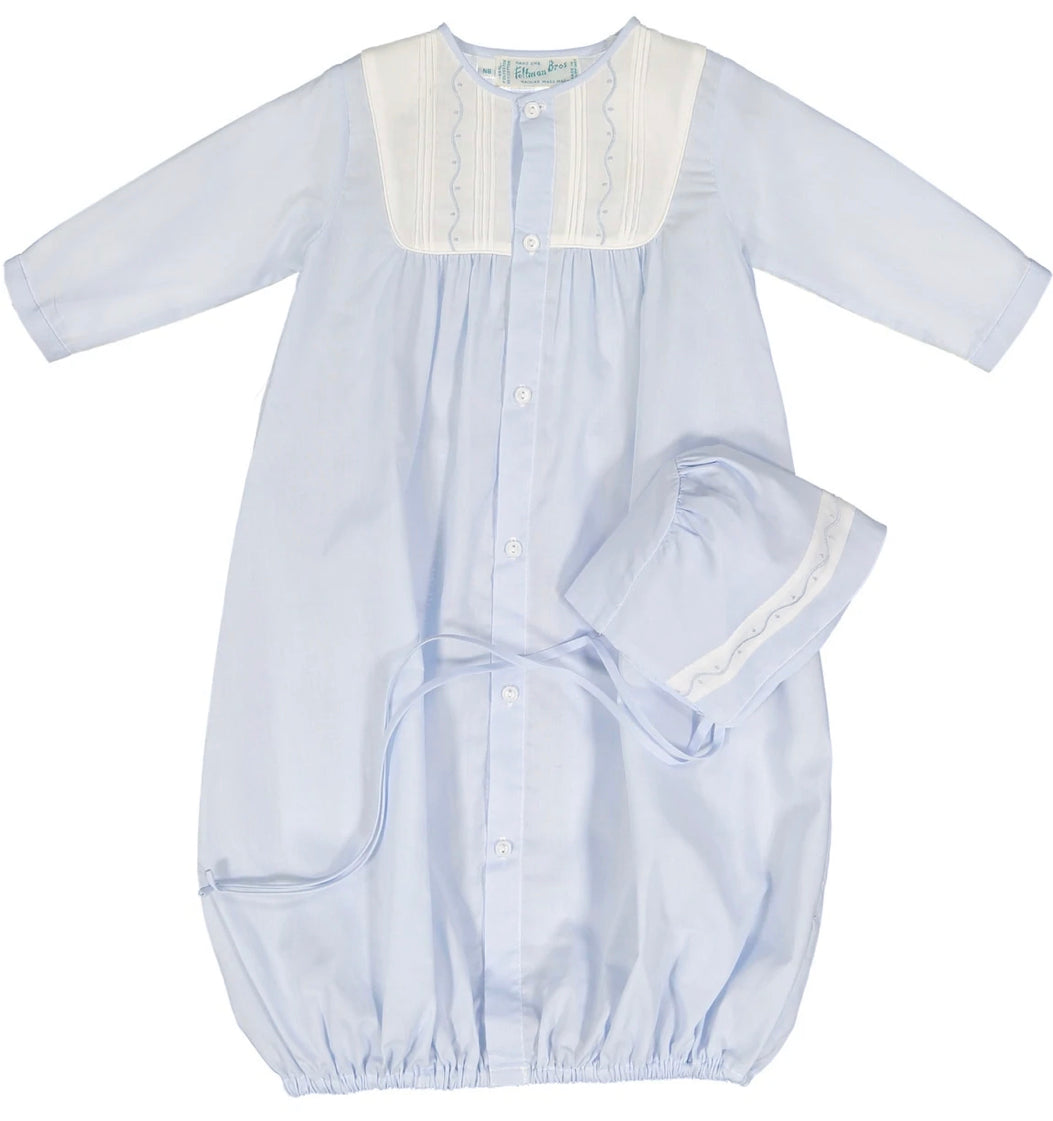 What a precious little take me home gown for your precious little boy! Fine pintucks line the yoke as well as a beautiful wave and dot embroidery design matching the one on the hat. Small pleats descend from the yoke until the elastic finish at the bottom of the gown. A perfect combination of simple yet detailed, this classy piece is destined to become a favorite to last generations! (Includes matching hat)
